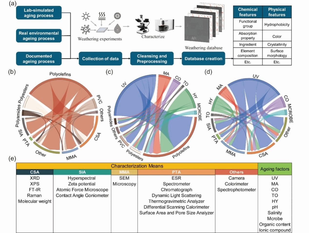 该论文首次报道了利用数据科学从多维度揭示了经过不同老化历程的微塑料老化特征的差异性,揭示了不同老化特征之间对预测准确率的互补性,并且利用多模态老化特征建立了塑料老化历程预测模型。首次将老化微塑料的各种特征综合到一个统一的框架中,实现了对微塑料老化历程的定量分析。增强了我们对MPs老化行为的理解,从而为减轻 MPs 污染提供了有价值的见解。