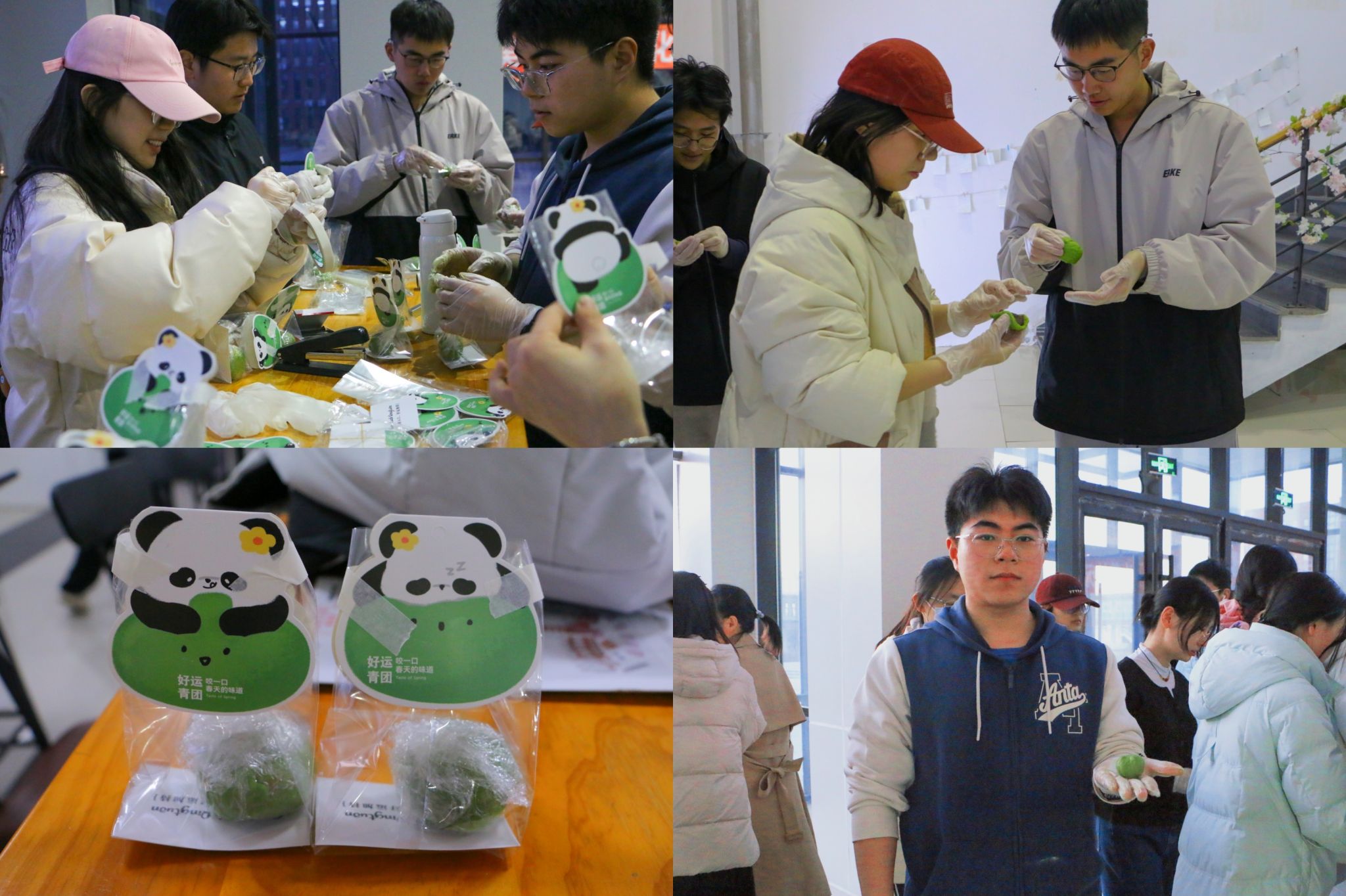 与此同时,在D07玻璃房青团制作区也洋溢着艾草的清香与欢声笑语。为兼顾安全性与参与感,活动选用预拌粉简化流程,学生们在查阅资料后自主探索传统技法:将青汁预拌粉与温水调和成柔软面团,包裹豆沙、蛋黄等馅料,再揉捏成圆润饱满的团子。尽管省去蒸制环节,但同学们仍通过调整馅料比例、设计印花模具,赋予青团独特的创意与个性。