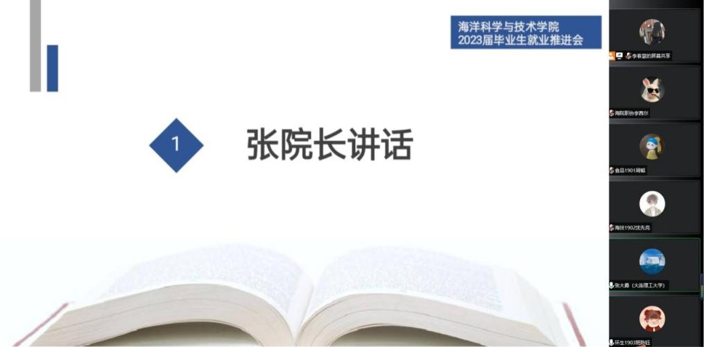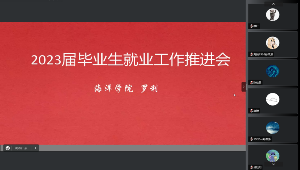 即将毕业的高校青年的就业关系民生福祉、经济发展和国家未来,为了加强同学们对就业的认识,了解当前就业形势,提升学院毕业生的就业竞争力,做好当前和今后一段时期学院毕业生的就业创业工作。海洋科学与技术学院于2022年9月14日下午16:30线上召开了2023届毕业生就业推进会。学院院长、党委副书记张大勇、党委副书记兼副院长罗利参加会议,会议由2019级辅导员李春慧主持。