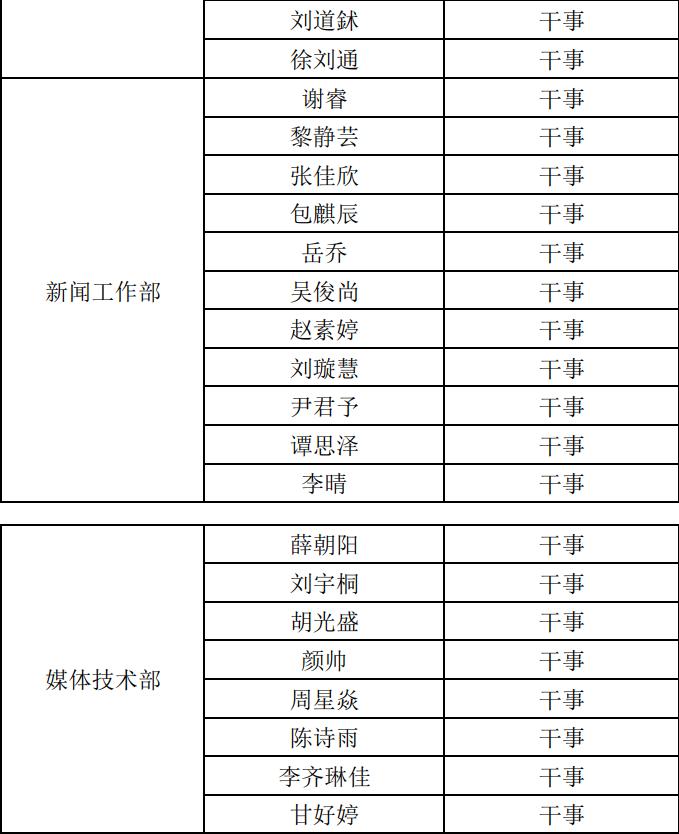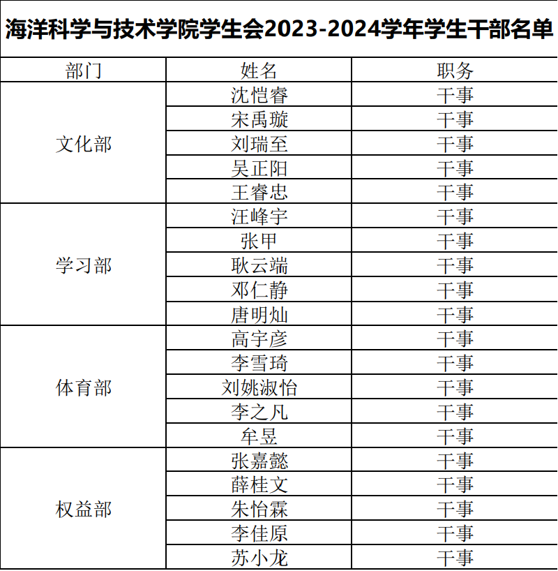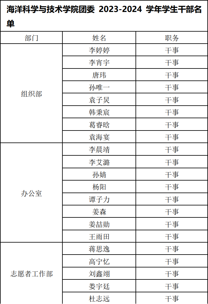 经过材料初审、面试等环节的综合考量,共青团太阳集团tyc33455官网海洋科学与技术学院委员会、太阳集团tyc33455官网海洋科学与技术学院学生会22023-2024学年学生干部纳新名单现已确定,详情如下: