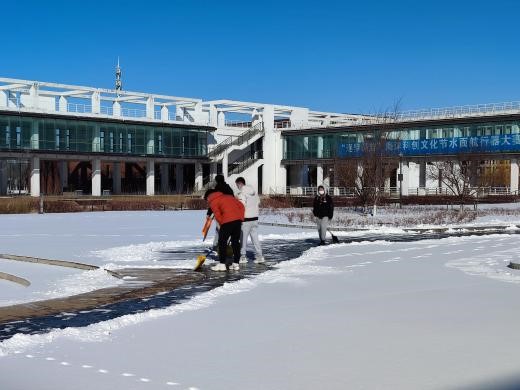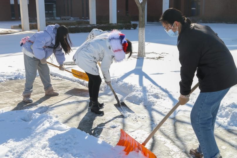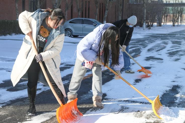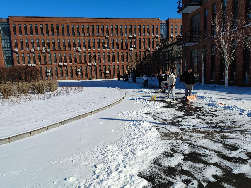 上午十点,志愿者前往D06,与学生党员进行交接工作,继续完成积雪清理。青年们的齐心协力与协调分工增进了学生之间的友情,增强了志愿者的凝聚力。经过一个多小时的奋战,道路上的积雪已被清扫干净,保证了海院师生的正常出行。