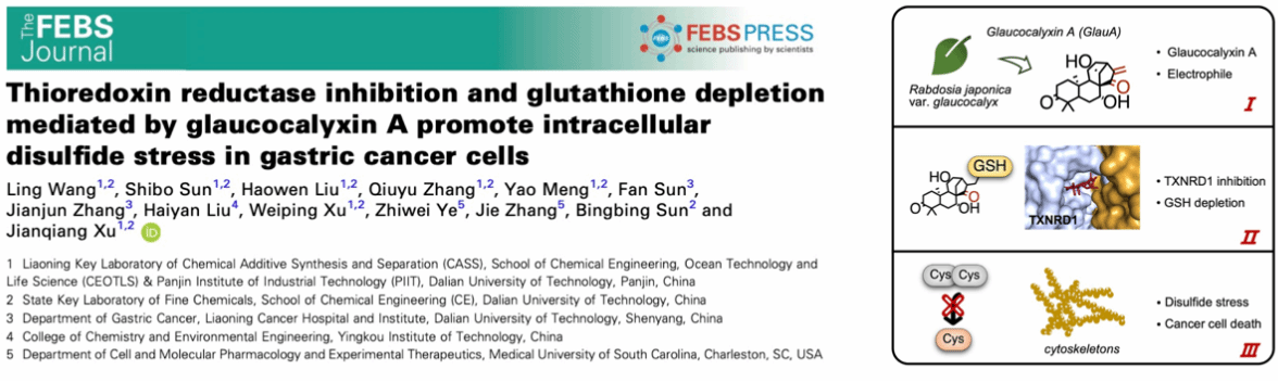Associate Professor Jianqiang Xu and his colleagues at Panjin Campus of Dalian University of Technology (DUT), recently reported that a natural diterpene glaucocalyxin A (GlauA) extracted from Rabdosia japonica var. glaucocalyx, was identified as a novel inhibitor of selenoprotein TXNRD1. They found that GlauA effectively causes TXNRD1 inhibition and GSH depletion, disrupts the redox balance of tumor cells, thereby triggers the disulfide stress and ultimately leading to gastric cancer cell death, by using three gastric cancer cell lines. They further demonstrated that another well-known TXNRD1 inhibitor, the FDA-approval drug auranofin, may promote the aggregation of the cytoskeletal protein Talin-1 protein in AGS cells, and support the effectiveness of targeting TXNRD1 anticancer strategy by disrupting redox homeostasis and inducing disulfide stress in gastric cancer cells.